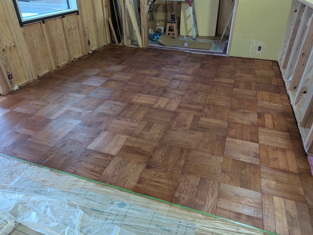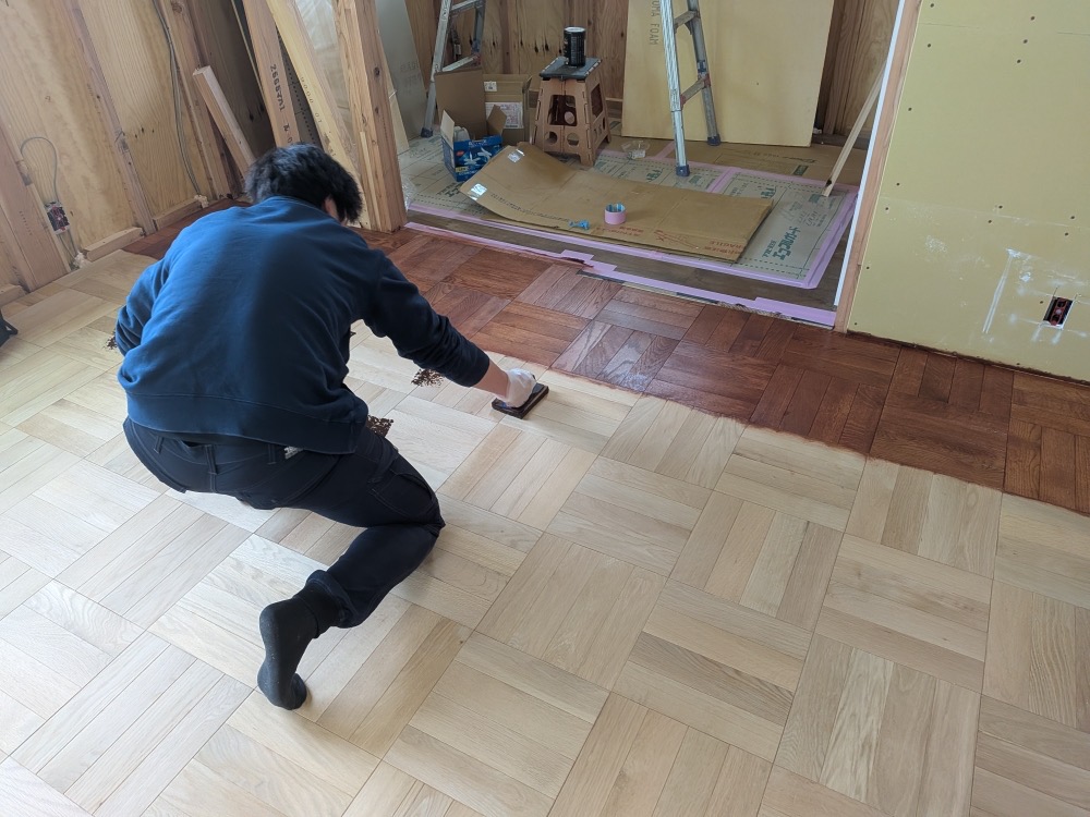 H様邸は、リビングのパーケット床張り&塗装作業が終わりました!アンティークっぽい色味でかっこいい感じに仕上がりました。無垢なので経年変化するごとにより馴染んで味わいが出てきます!